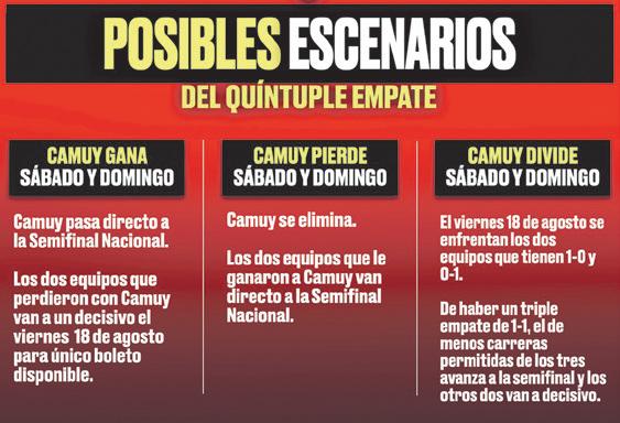 Camuy recibió un comodín por haber jugado para 3-1 entre los cinco equipos empates. Los dos ganadores del viernes se enfrentarán con los Arenosos este sábado y el domingo. De ser necesario, también se jugará el fin de de semana del 18 de agosto.