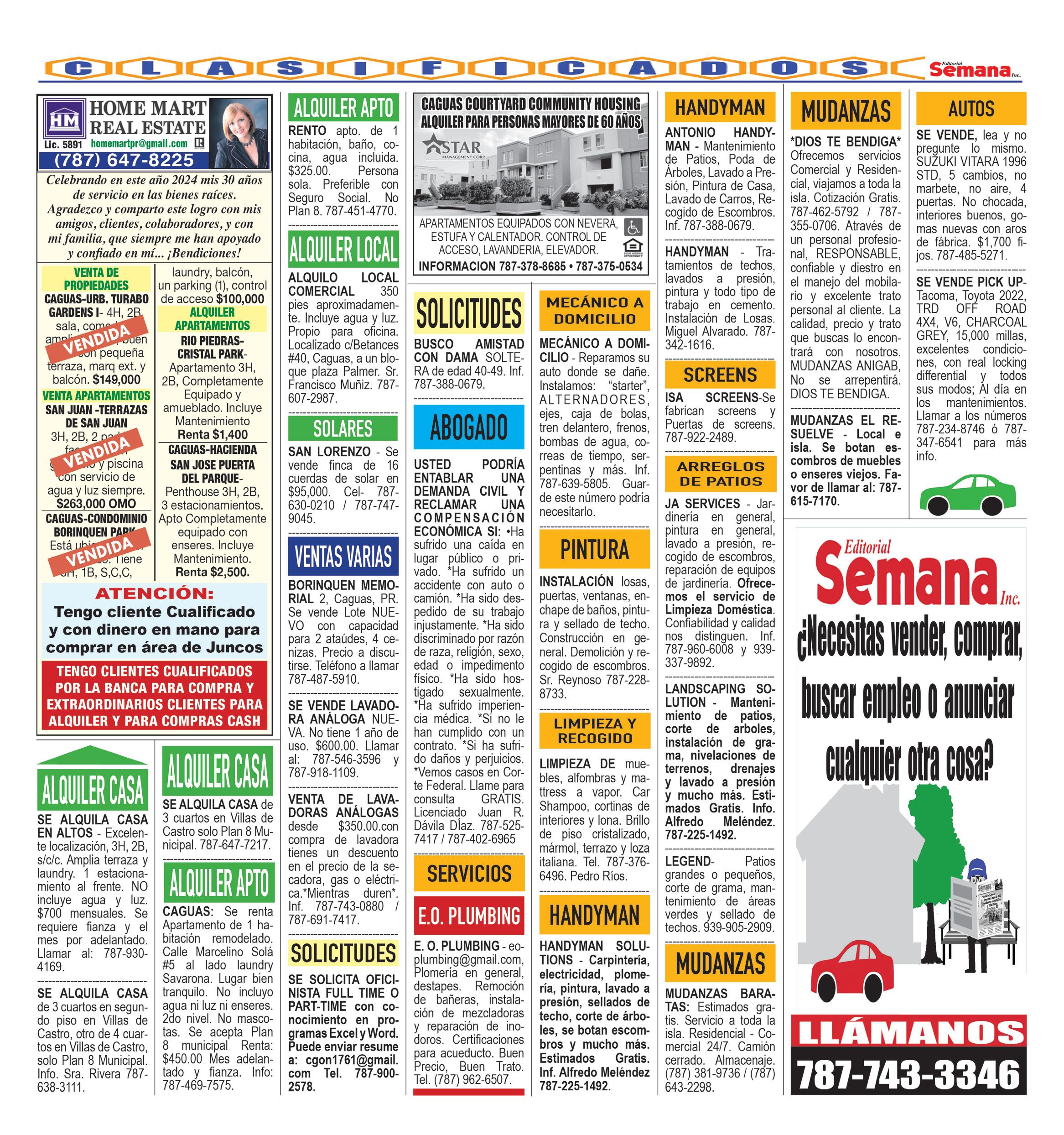 Los artes de anuncios confeccionados por esta publicación no podrán ser reproducidos por el anunciante bajo ninguna circunstancia, sin previa autorización de la empresa. Los artículos firmados son de la completa responsabilidad de sus autores, y no reflejan, necesariamente, la opinión de EDITORIAL SEMANA, INC. Nos reservamos el derecho a editar toda información antes de ser publicada. La empresa editora no se compromete a devolver originales de fotos u otro material sometido para su posible publicación.
