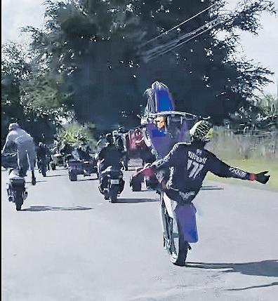 Dos jóvenes “wheeleando” arriesgan sus vidas y la de otros que están cerca, en una corrida ilegal. Ninguno de esos vehiculos cuenta con tablillas.