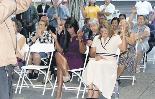 La alcaldesa de Humacao, Rosamar Trujillo Plumey, durante la primera de las actividades de oración pautadas como parte del decreto, celebrada en la Plaza de Recreo Luis Muñoz Rivera. Le acompaña la representante Sol Higgins Cuadrado.