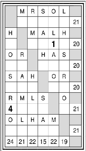 Cada letra representa un número del 1 al 7. Para resolver este numerograma, ponga debajo de cada letra el número correspondiente y que al final coincida con las sumas de la derecha y de la parte inferior. Como ayuda damos el valor de dos letras:
