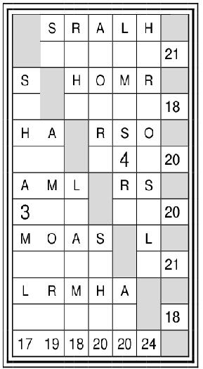 Cada letra representa un número del 1 al 7. Para resolver este numerograma, ponga debajo de cada letra el número correspondiente y que al final coincida con las sumas de la derecha y de la parte inferior. Como ayuda damos el valor de dos letras: