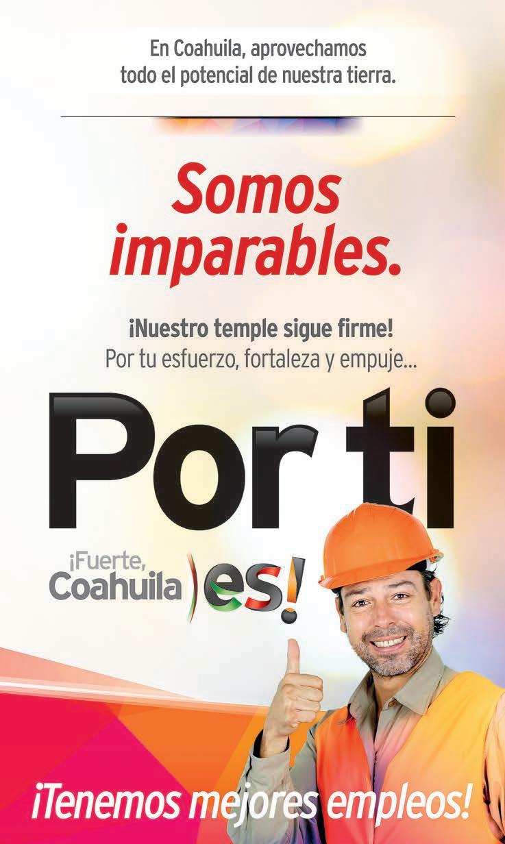 En gira de trabajo por la Comarca Lagunera, el goberna- dor Miguel Ángel Riquelme Solís acompañó al Presidente Andrés Manuel López Obrador y al gobernador de Durango, Esteban Alejandro Villegas Villarreal, en el recorrido de supervisión de la presa derivadora del proyecto “Agua Saludable para La Laguna”. En el ejido Sapioriz, perteneciente a Lerdo, Durango, los mandatarios federal y estatales revisaron los avances de dicho proyecto, el cual garantizará el abasto de agua de calidad para todos los habitantes de la Comarca Lagunera. Al término de la visita del Presidente de la República, el gobernador Miguel Riquelme mencionó que ambas entidades, así como el Gobierno Fe-