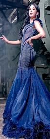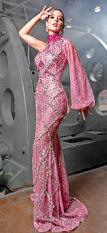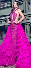 z Vestido de corte sirena en encaje color magenta con plumas, cristales de diferentes tamaños y cauda larga, de Arturo Jimenez @arturo_novias portado por Melissa Flores, MXU Michoacán 2022.