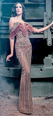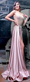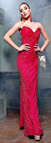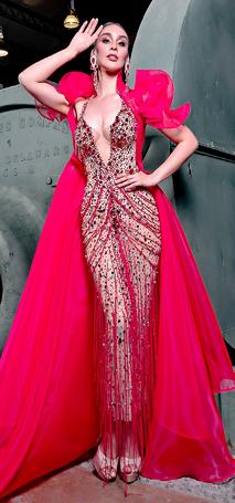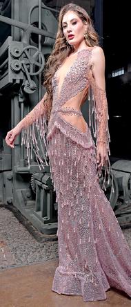 El vestido triunfador de esta ocasión se llama “Realeza Mexicana”, un diseño desmontable color nude con cristales, flecos y pedrería en rojo y rosa que destacan la silueta latina y reflejan la cultura mexicana. Y se acompaña a juego de un ensamble que es tipo abrigo con cuello chimenea y maximangas con cauda en rojo y un rosa mexicano incomparable.
