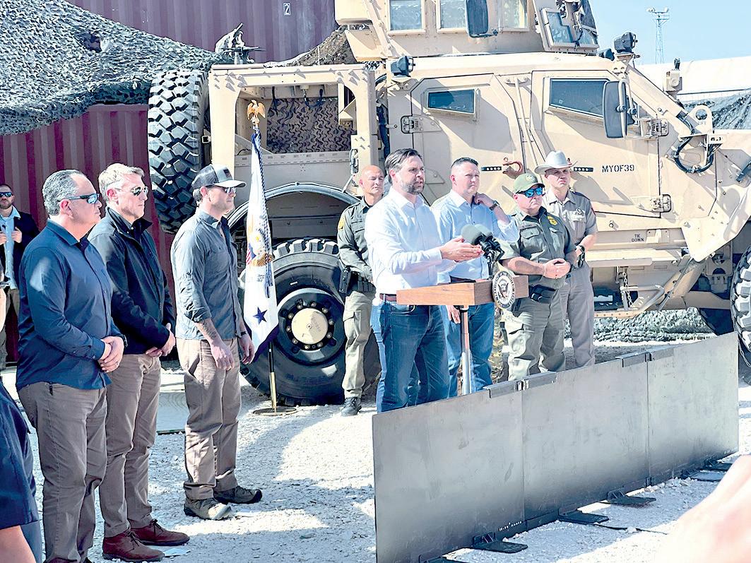 z Durante su visita por Eagle Pass, acompañado por el secretario de Defensa, Pete Hegseth, y la directora de Inteligencia Nacional, Tulsi Gabbard, James David (JD) Vance recorrió en helicóptero la frontera de Eagle Pass con Coahuila, a la par de que insistió en que se reforzará la presencia militar en toda la frontera para frenar el tráfico ilegal de personas y de drogas.