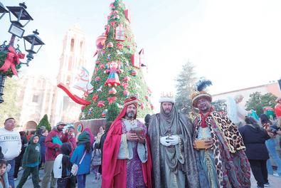 Cientos de familias se reunie ron en la Plaza de Armas de la capital de Coahuila en don de convivieron con el gober nador Manolo Jiménez Salinas, su esposa Paola Rodríguez López, sus hijos, así como Li liana Salinas Valdés, presiden ta honoraria del DIF Coahui la, además del alcalde Javier Díaz González y su esposa Luly López, en la tradicional rosca de reyes.