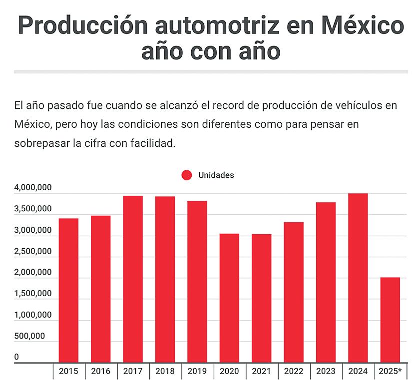 El año pasado, la producción automotriz nacional quedó a apenas 10 mil unidades de alcanzar la meta, impulsada por una demanda rezagada tras la pandemia que, durante años, no pudo atenderse plenamente debido a las disrupciones en las cadenas globales de suministro. Pero ese impulso ya no está presente. Actualmente, no existe una demanda contenida y, además, las condiciones de libre comercio bajo el T-MEC po-