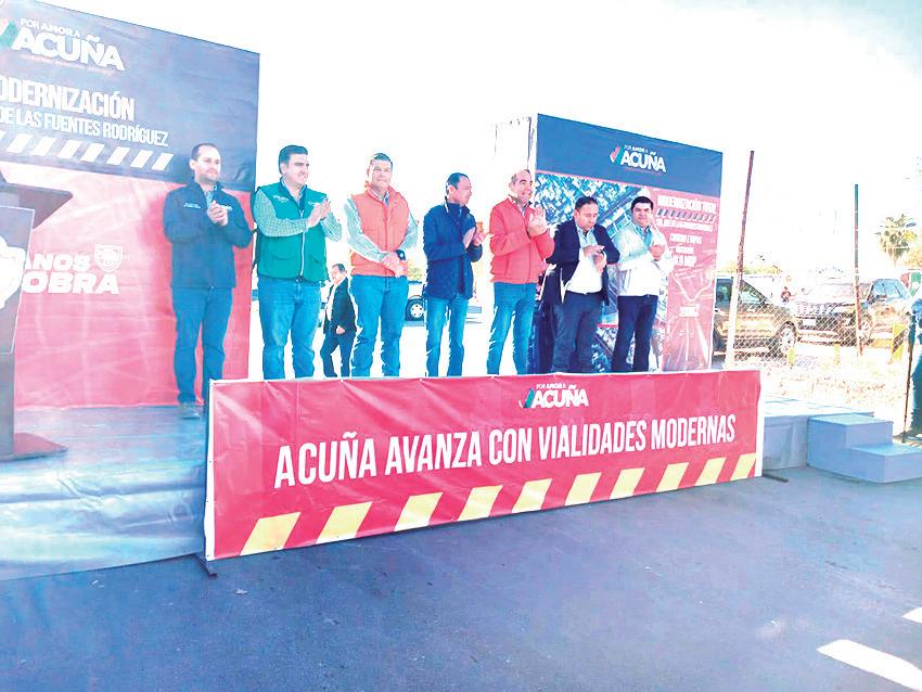 Bajo el lema Acuña avanza con vialidades modernas, el alcalde Emilio Alejandro de Hoyos Montemayor, realizó ayer la entrega de los trabajos de rehabilitación en el Libramiento José de las Fuentes Rodríguez, obra para la que se destinó una inversión de 11.9 millones de pesos. Al destacar, que con la entrega de los trabajos terminados se avanza en cumplir el compromiso de mejorar las vialidades de esta frontera, De Hoyos Montemayor insistió en que éstas son parte de las acciones con las que se busca poner fin al rezago histórico que existía en la ciudad en materia de pavimentación y rehabilitación vial.