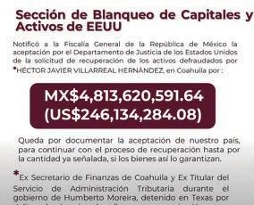 El gobernador Miguel Ángel Riquelme dijo que desde 2016 Coahuila hizo dos reclamaciones oficiales de los recursos incautados por el Gobierno norteamericano a Javier Villarreal, por tanto, es a esta entidad a la que se deben entregar los casi 5 mil millones de pesos.