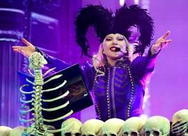 versión inocente de la cantante había sido derrotada. Pero en el segundo acto, Stefani Joanne Angelina Germanotta, su nombre real, renació, emergiendo de la tierra con un vestido blanco, rodeada de figuras esqueléticas, para interpretar “Perfect Celebrity”, una crítica velada a la fama y sus consecuencias.