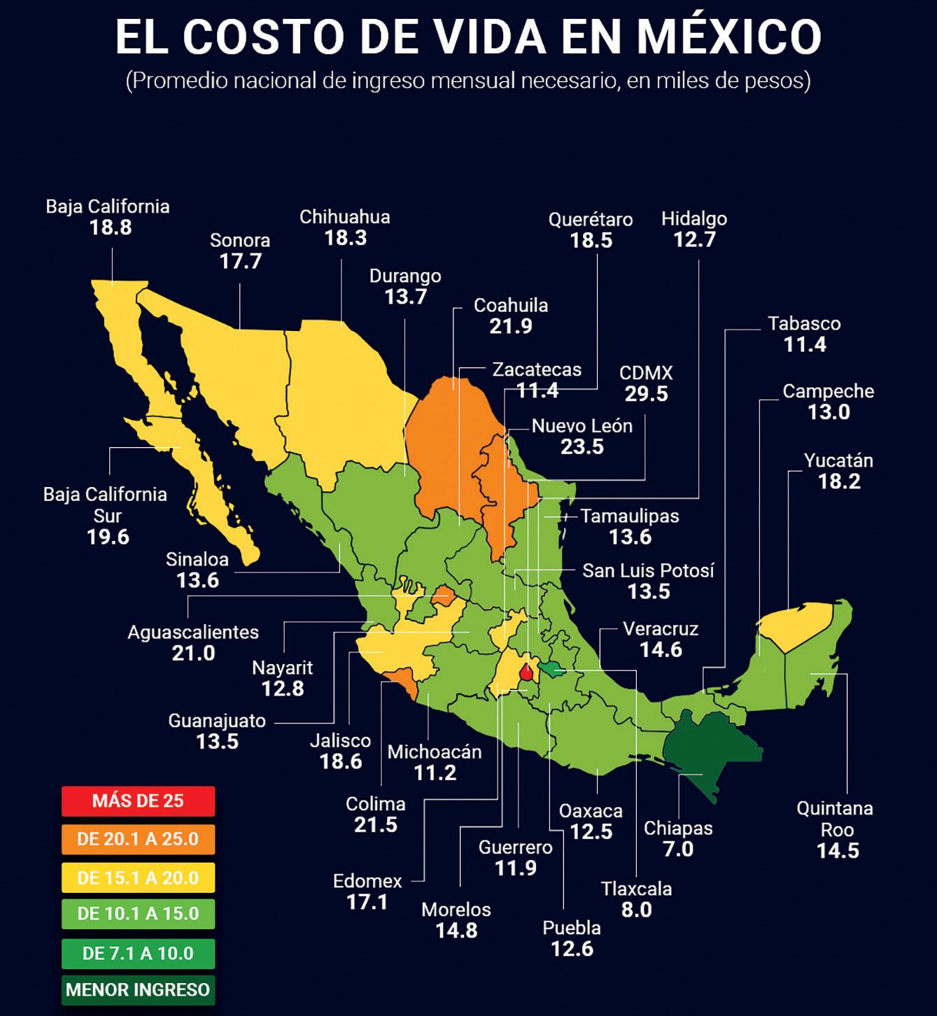 Este promedio varía considerablemente dependiendo de la región del país, reflejando las diferencias económicas y sociales entre los estados. En la Ciudad de México, el ingreso necesario alcanza los 29 mil 500 pesos, colocándose como la entidad con el mayor costo de vida. En contraste, Chiapas se posiciona en el otro extremo, donde un ingreso de 7 mil pesos es suficiente para satisfacer las necesidades básicas.