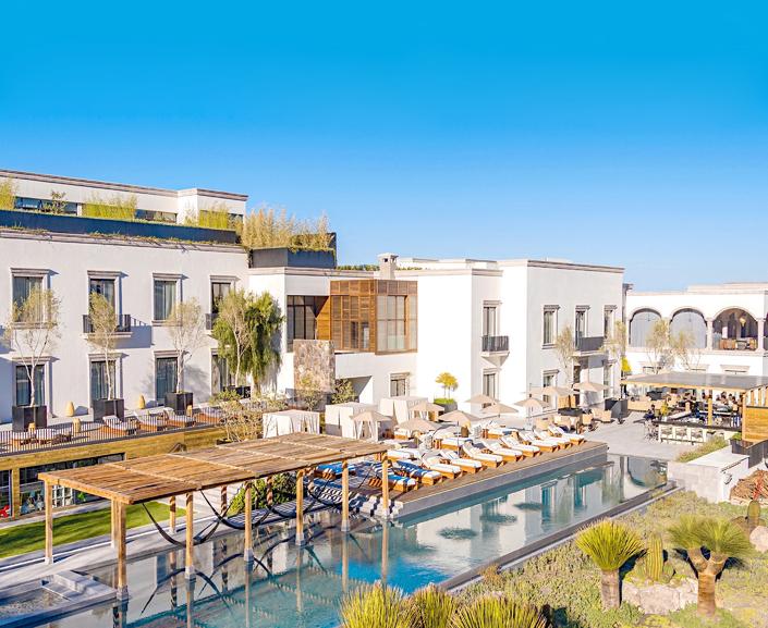 darte para encontrar la mejor excursión o darte el mejor tip para gozar del destino. Sus 150 habitaciones, ya sean sencillas, de luxe o sus magníficas suites, mezclan lo mejor del diseño internacional con toques mexicanos como los mosaicos del piso, la madera de los armarios y el tocadiscos retro con vinilos que hay a disposición del viajero. En este resort life-style de lujo, cada atmósfera se disfruta y siempre hay rincones, como sus grandes terrazas, que invitan a relajarse y a contemplar hermosas panorámicas. Además, el sitio es muy amable con los niños ya que cuenta con albercas y salones especiales. Por si no bastara, también esto pet friendly PURAS DELICIAS En este hotel nunca pasarás hambre ya que la experiencia gastronómica también requiere de tiempo para disfrutar y deleitarte con su gran oferta. Por ejemplo, el Zibu Allende sorprende con productos nacionales con toques asiáticos y el Restaurante Spice Market brinda platos de luChina, Japón y la India. El restaurante de Patio del Árbol, por otro lado, es famoso, además de su bella locación, por su brunch dominical, en el que no faltan quesadillas hechas al momento, birria y más antojos nacionales e internacionales maridados con música en vivo.