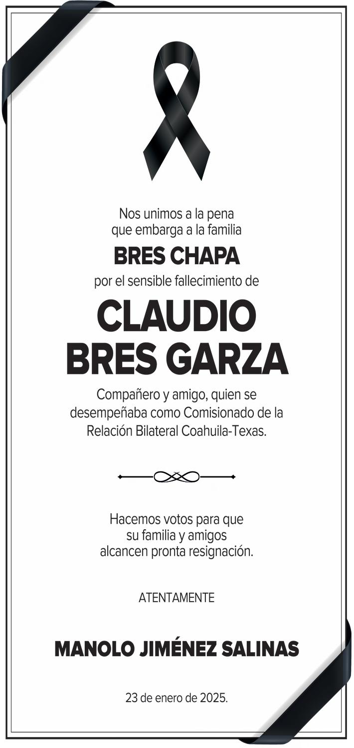 Claudio Mario Bres Garza, coordinador de la Comisión para asuntos bilaterales Coahuila- Texas, falleció ayer por la noche a los 67 años, en el Doctors Hospital de Monterrey, Nuevo León, donde se atendía del padecimiento de cáncer que le fue detectado hace poco más de un año.