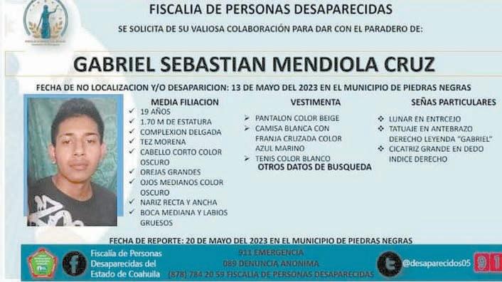 Gabriel Sebastián Mendiola Cruz, de 19 años, salió de su domicilio en la Ramón Bravo desde el pasado 13 de mayo, desconociendo los motivos.