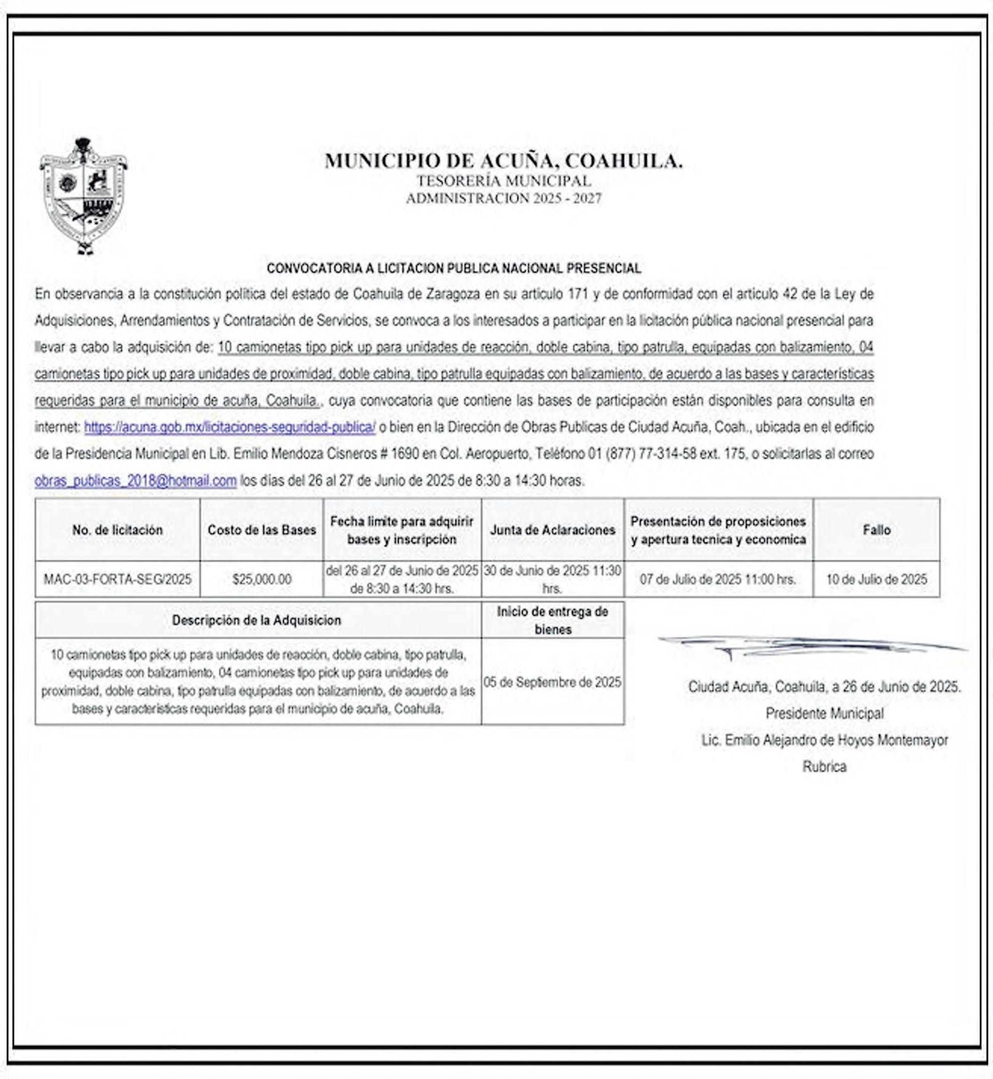 Por el principio de unanimidad, los regidores aprobaron lo que fue la presentación del Plan de Obra Municipal 2025 dentro del cual se contempla el desarrollo de obras que contribuyen a mejorar la imagen de la ciudad y la calidad de vida de las familias acuñenses, así lo dio a conocer el alcalde Emilio Alejandro de Hoyos Montemayor. Mencionó que dentro de estos proyectos se contemplan las obras de pavimentación, la mejora de los espacios públi cos y deportivos, el desarrollo de anteproyectos prioritarios, la asignación de recursos pa ra el proyecto de construcción del segundo puente interna cional. Algunos de los proyectos se estarán desarrollando de forma conjunta con la Federación y el Estado ya que se trata de obras de gran magnitud