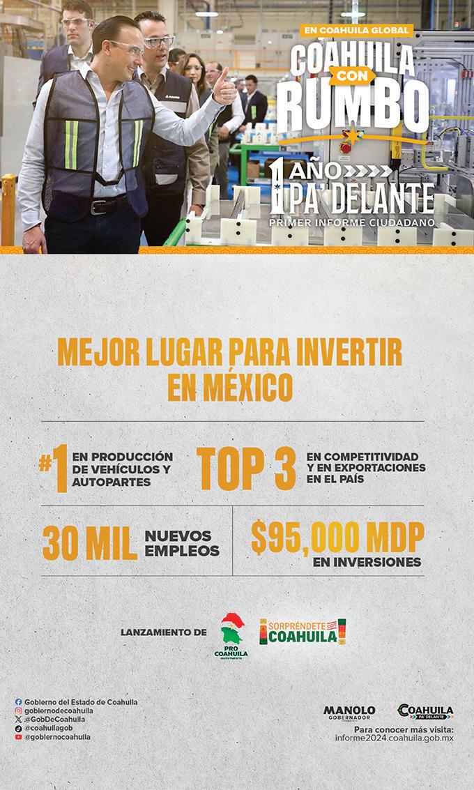 Coahuila es una de las entidades de la República que tienen un alto puntaje en progreso social, y que son las que están atrayendo las inversiones por nearshoring, advirtió un estudio de México ¿Cómo vamos?