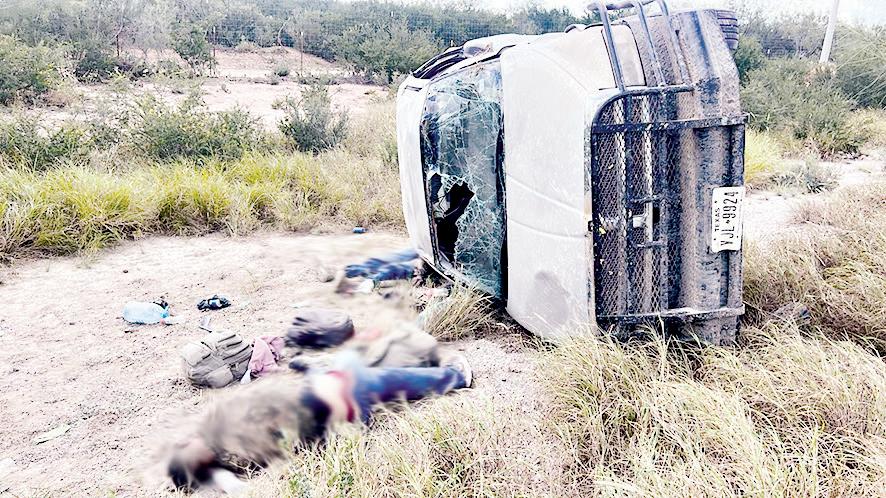 Dos presuntos migrantes per dieron la vida ayer en un acci dente en la carretera Ribereña, mientras se desplazaban a la altura de la empresa Arena Sí licas, de acuerdo con elemen tos de la Guardia Nacional división carreteras. El accidente ocurrió a la altura del kilómetro 87, cuando dos sujetos, aún no identificados y que se presume pueden ser migrantes, se desplazaban en una camioneta pick up doble cabina gris modelo RAM, de la marca Dodge, la cual sufrió una volcadura. Al dar volteretas en la parz Las autoridades indagan si podría tratarse de migrantes. te lateral de la carretera, los cuerpos salieron proyectados y quedaron afuera del vehículo y a un costado de la vialidad. La camioneta aplastó a una de las víctimas, mientras que el otro sufrió fracturas múltiples que le costaron la vida.