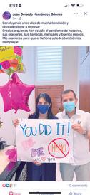 Una fotografía donde se ve al padre y a Cecilia Morales, su amiga y receptora de su donación enfatiza en varias frases como: “You did it” (Lo hiciste), “Bye bye hemo” (adiós hemodiálisis) y “We love you” ( te amamos) es la que ha subido al despedirse.