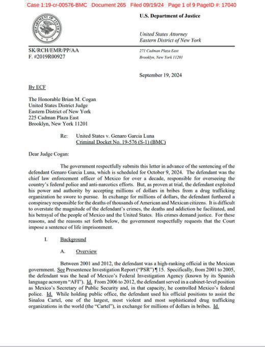 La Fiscalía del Distrito Este de Nueva York subrayó que el exsecretario de Seguridad Pública durante el sexenio de Felipe Calderón, Genaro García Luna, merece ser condenado a cadena perpetua y a una multa mínima de 5 millones de dólares, al acercarse la fecha de su sentencia, que el juez Brian Cogan leerá el 9 de octubre.