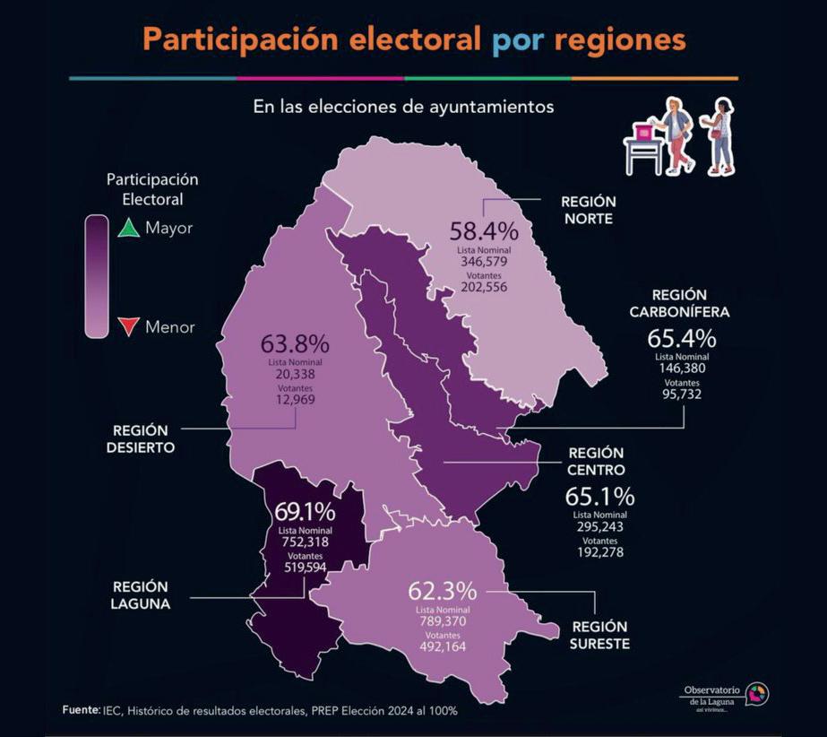 En segundo lugar se posiciona la Región Carbonífera, con el 65.4%; seguido de la Región Centro, donde 65% del electorado votó; en cuarto lugar está la Región Desierto, con el 63% de participación; en quinto lugar, la Región Sureste, con el 62.3%, y la Región Norte registró el menor entusiasmo para acudir a las casillas, ya que solo el 58% del electorado participó.