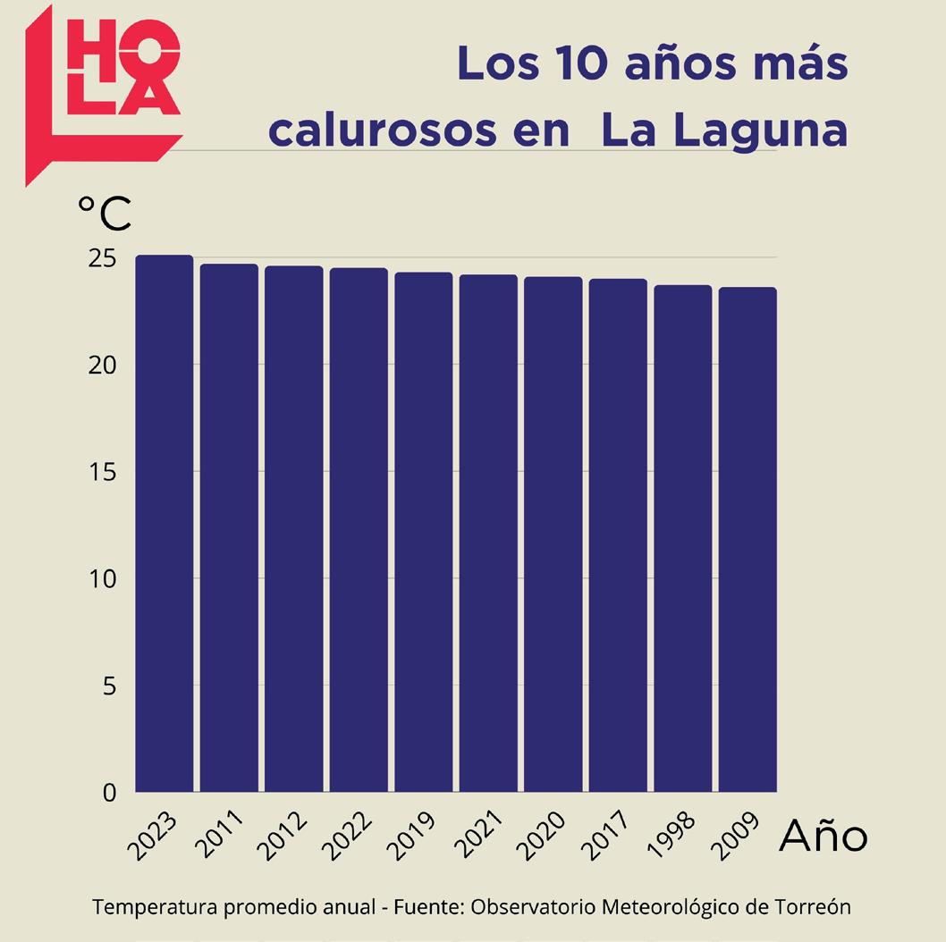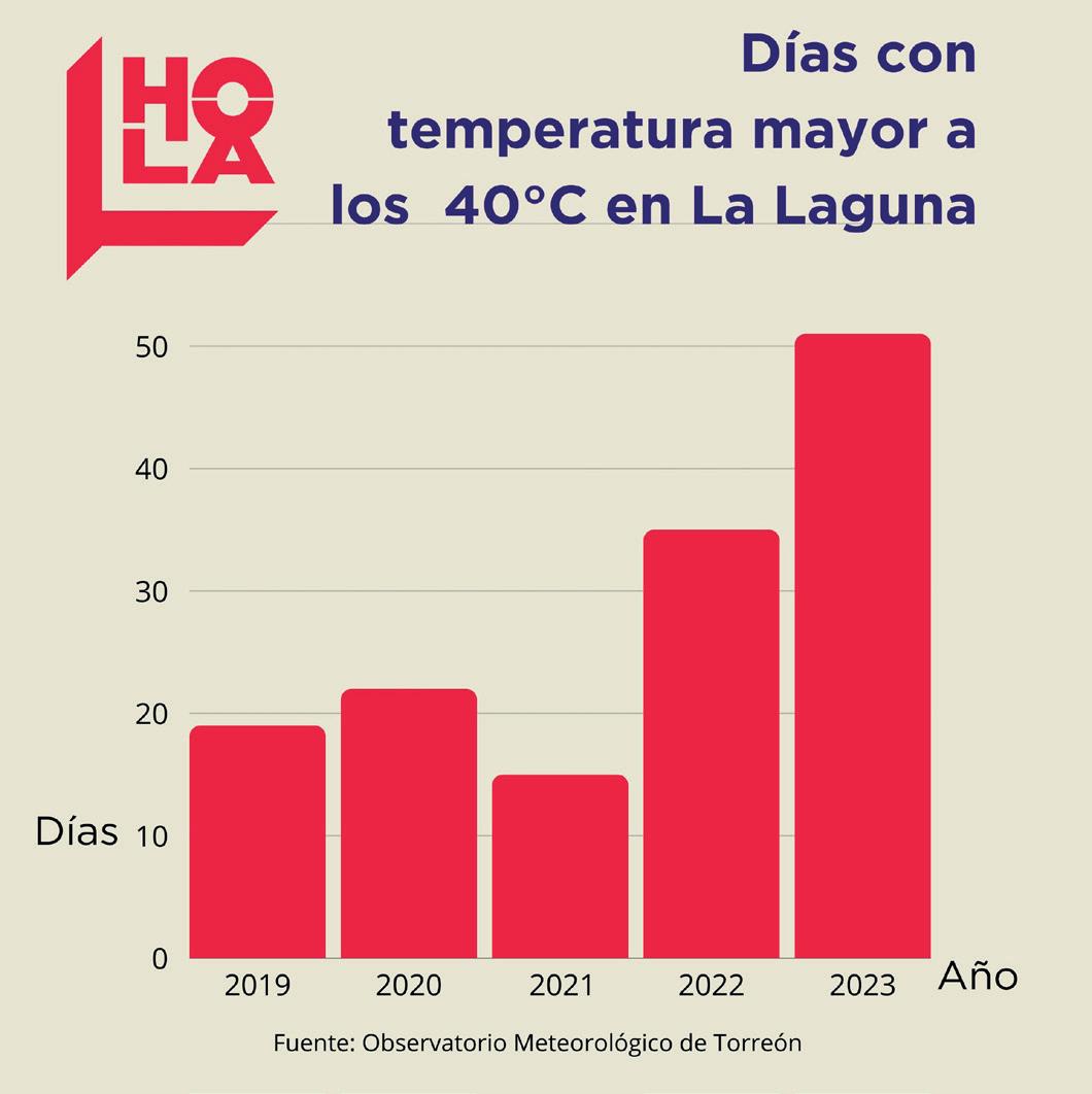 El año 2023 se posiciona como el más caluroso en la historia de La Laguna, con un promedio anual de temperatura de 25.1°C. En este año, se registraron 51 días con temperaturas por encima de los 40°C.