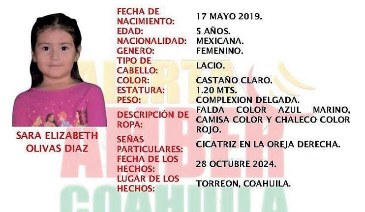 La Fiscalía de Personas Desaparecidas de Coahuila activó la Alerta Amber por la sustracción de una menor de 5 años en el municipio de Torreón. Según la ficha de búsqueda, el 28 de octubre fue vista por última vez en compañía de su madre en su centro educativo, ubicado en la colonia Residencial Las Torres. Sara Elizabeth Olivas Díaz fue presuntamente sustraída luego de que un juez le otorgara la guardia y custodia al padre de la menor, quien ya interpuso una denuncia ante las autoridades de esta región. n Mariana Mejía
