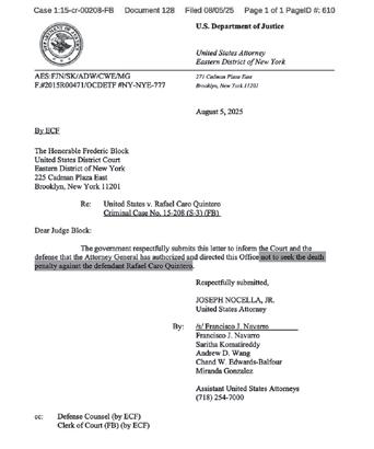El Departamento de Justicia de Estados Unidos anunció ayer que no solicitará la pena de muerte para los capos del narcotráfico Ismael “El Mayo” Zambada, Rafael Caro Quintero y Vicente Carrillo Fuentes. La información se dio a conocer a través de documentos oficiales dirigidos a los jueces encargados de los casos.