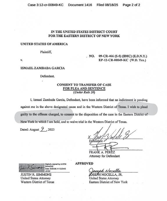 Zambada tiene programada una audiencia el 25 de agosto, sin embargo, de acuerdo con documentos judiciales, Zambada usará esa audiencia para cambiar su declaración a “culpable” ante el juez Brian M. Cogan, el mismo que llevó el caso de Joaquín Guzmán Loera, “El Chapo”. El cambio de declaración, que indica que el cofundador del cártel de Sinaloa llegó a un acuerdo con el Gobierno de Estados Unidos, se produce después de que el 5 de agosto el Departamento de Justicia informara que no buscará la pena de muerte contra Zambada, acusado de delincuencia organizada, blanqueo de dinero y narcotráfico.