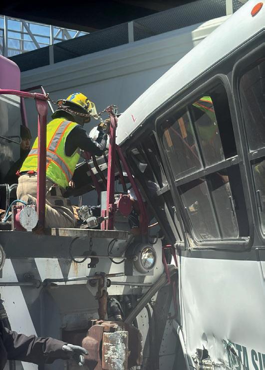 z Una unidad de la ruta Panteones número 39, impactó ayer por la tarde contra una locomotora en movimiento, en el cruce ferroviario del bulevar Rodríguez Triana. z De acuerdo con el reporte, el conductor Kevin Emiliano, de 21 años, habría perdido el control del camión tras una falla en los frenos. El hombre resultó con golpes en el fémur y en la cabeza.