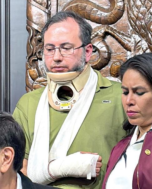 A través de redes sociales, especialistasen medicina y traumatología, señalaron presuntas negligencias en la atención brindada al trabajador del Senado, el cual fue aventado por “Alito” Moreno. Uno de ellos el médico y activista Héctor Rossete, que puntualizó lo siguiente: z Collarín rígido flojo, sin soporte real e innecesario. z Vendaje de muñeca sin férula ni inmovilización, no tiene utilidad terapéutica. z Cabestrillo mal puesto y simulado, no descarga ni coincide con la supuesta lesión.