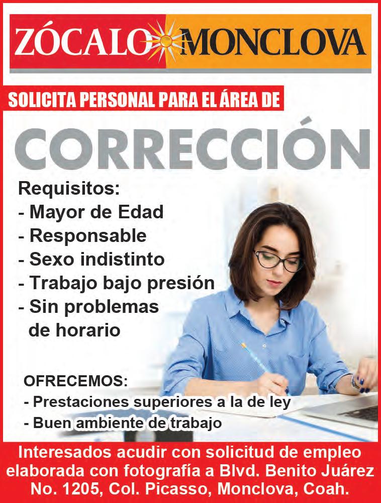 SOLICITA Personal de Limpieza. Actividades a realizar: Lavar ropa, Planchar, Cocinar, Barrer, Trapear, Limpieza de muebles, Lavar baños, LImpieza general adentro/afuera. Requisitos:*Experiencia limpieza mínimo 1 año,*2 Cartas de recomendación. Sueldo $1,750 más prestaciones de ley, lunes a sábado 8:00a.m a 5:00p.m 1 hora de comida. Comunicarse 811578-56-36/866632-18-16 rh.publimarx@outlook. com Niguel Ramos Arizpe #243, Zona Centro, Monclova. (58933 : 10-Jul : 01-Aug)