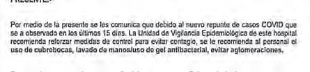 “Debido al nuevo repunte de casos Covid que se ha observado en los últimos 15 días la unidad de vigilancia epidemiológica recomienda aplicar medidas de control para evitar contagio”, dice la circular fechada el 18 de julio.