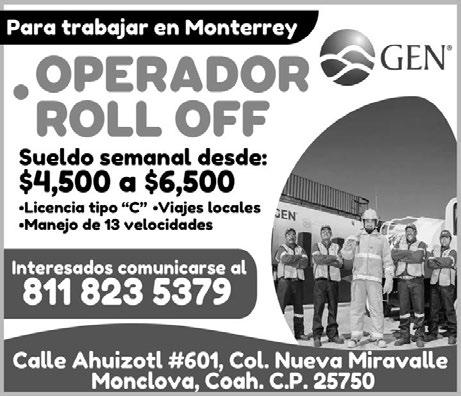 Empresa transportista solicita el siguiente personal: 2 ayudantes de mecánico, 1 soldador, 2 lavadores y 2 guardias. Mayor información en Av. Sidermex No.104, Col. Obrera Sur 2do. Sector en Monclova, Coahuila. Tel. 866-636-54-12. (58376 : 26-Jul : 10-Aug) Se solicita ayudantes en general. Informes al telefono 811-531-8832, 866-172-38-29. (58377 : 26-Jul : 10-Aug)