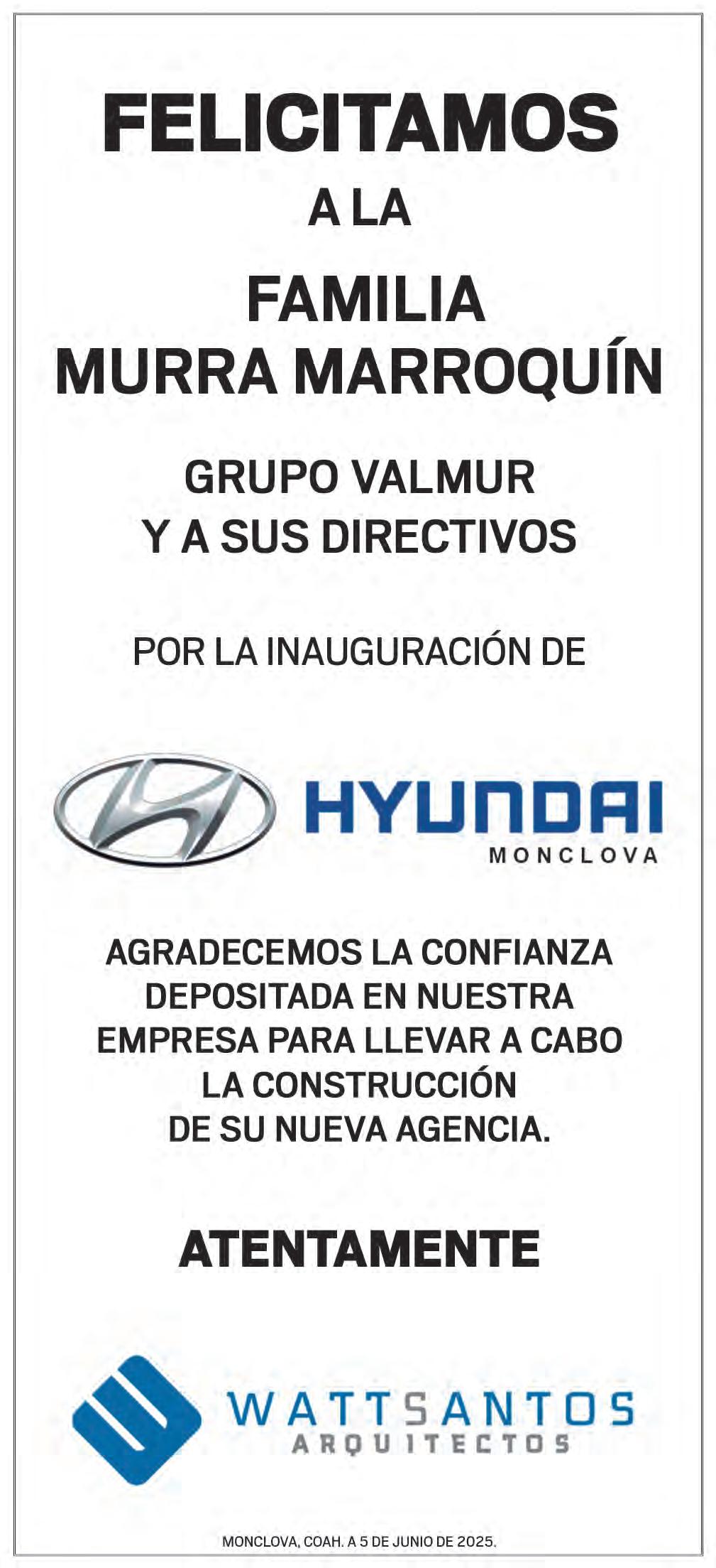 En la inauguración de la Agencia Hyundai Monclova, el alcalde Carlos Fernando Villarreal Pérez extendió un profundo agradecimiento a los directivos de Grupo Valmur, el presidente del Consejo de Administración, Guillermo Murra Talamás, y el director general, Guillermo Murra Marroquín, por su confianza e importante inversión en la ciudad.