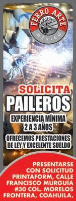 FH Solicita Pailero, Soldador, Ayudante (con experiencia Industrial) e Inspector de seguridad. Contratación Inmediata. Informes 866-13512-72 (58188 : 04-May : 12-May)