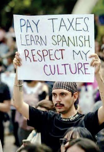 se ven mensajes como “paga impuestos, aprende español, respeta mi cultura”, y “no es tu hogar”, para resaltar su campaña contra los indocumentados.