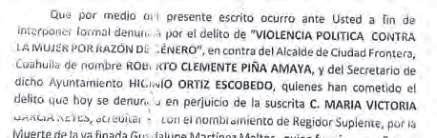 Justo en el Día Internacional de la Mujer, María Victoria García llegó hasta la Fiscalía Especializada en Delitos Electorales para denunciar a Roberto Piña Amaya y a Higinio Ortiz Escobedo.