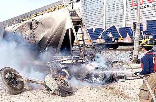 La maquinaria del tren y un tráiler de residuos peligrosos protagonizaron un aparatoso choque, explosión e incendio al norte de la ciudad, luego de que el atrabancado chofer del tráiler intentó ganarle el paso al ferrocarril, lo cual alertó a socorristas y autoridades hacia el lugar, tras el reporte de personas gravemente lesionadas. El impactante suceso se registró cerca de las 09:20 horas en el cruce ferroviario ubicado en el kilómetro 18 en Las Adjuntas, hasta donde arribaron paramédicos de Cruz Roja, SAMU, elementos de Bomberos de Monclova y Frontera, así mismo efectivos de la Guardia Nacional y PCC para tomar