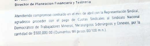 En el cuerpo del documento se lee, textualmente, “atendiendo compromiso contraído en el mes de abril con la Representación Sindical, agradezco proceder con el pago de Cuotas Sindicales al Sindicato Nacional Democrático de Trabajadores Mineros, Metalúrgicos y Conexos, por la cantidad de $500,000.00 (Quinientos mil pesos 00/100 m.n.)”. Igualmente, aparece un supuesto número de cuenta bancaria, donde se habría de depositar el presunto pago.