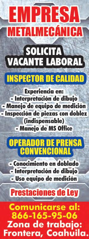 Se solicita tornero para trabajar en taller de maquinados de Ramos Arizpe, no importa edad, se dara hospedaje. Interesados comunicarse al telefono 844-598-44-35. (59510 : 10-Dec : 01-Jan)