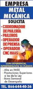 IMPORTANTE SOLICITA OPERADORES, MANDRILADORSISTA MANUAL Y CNC (CON EXPERIENCIA). INTERESADOS FAVOR DE COMUNICARSE TEL. (866)636-77-73, (866) 636-77-74. (59019 : 24-Sep)