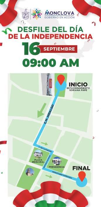 Rosa Dina Rotuno y Gladis Villarreal Gonzalez, regidora y directora de Educación, informaron que a las 8 de la noche se iniciarán los eventos en la Presidencia Municipal con la fiesta del Grito de Independencia, que contará con la participación de artistas locales y regionales, incluyendo mariachi y banda. El momento culminante, será a las 10 de la noche cuando el Alcalde iniciará la ceremonia del tradicional Grito de Independencia y posteriormente continuará la fiesta. La priotecnia deslumbrará a la ciudadanía ésta noche, donde los fuegos artificiales desplegarán su colorido luminoso en el cielo monclovense.