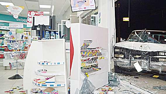 Y justo al salir de la farmacia, fue embestida por una camioneta pickup conducida por Juan Pablo Lozano, quien incluso ingresó la unidad al negocio, rompiendo cristales, estantes y causando lesiones a una dependienta.
