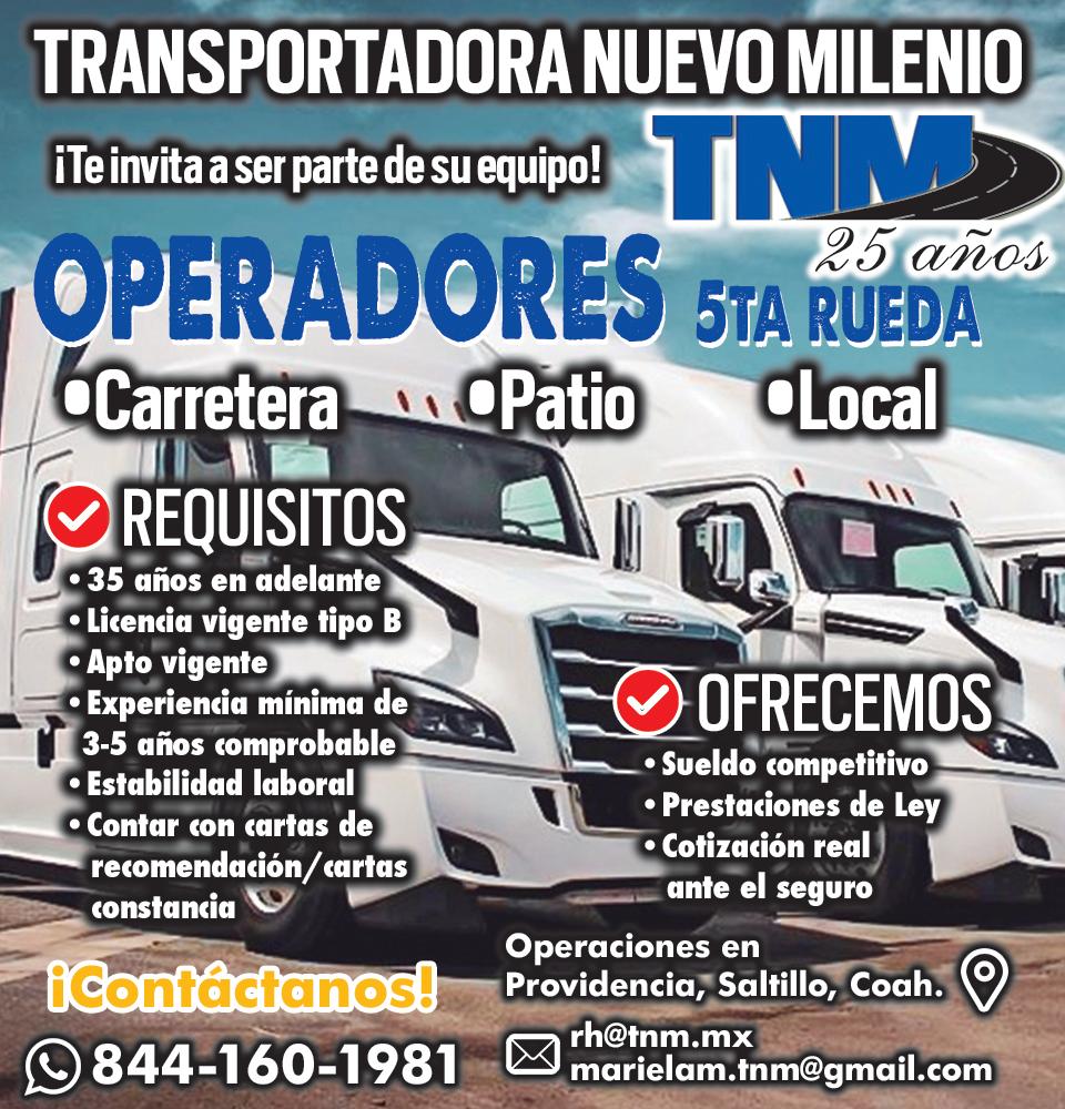 importante en el ramo de Minería y Transporte solicita: MECÁNICO DIESEL experiencia en reparación de tracto camiones de punta a punta (motor /transmisión /marchas /frenos /sistema hidráulico y neumático) motores CATERPILLAR, CUMMINS, Volvo, Manejo de herramienta de diagnóstico E.T. e INSITE, Volvo. TÉCNICO MAQUINARIA A Experiencia en reparaciones mayores CATERPILLAR /CUMMINS motor /transmisión /marchas, convertidores, frenos, mandos finales, sistema hidráulico y eléctrico, Manejo de herramienta de diagnóstico E.T. e INSITE. INGENIERO DE MANTENIMIENTO INDUSTRIAL (Jefe de taller) Experiencia en manejo de personal, mecánica y mantenimiento de piso, conocimiento en líneas de alta, media y baja tensión y panel de instrumentos, conocimiento en mecánica de molinos VSI flecha vertical, trituradora de martillo y triturador de listón, reductores y transmisiones para banda transportadora, cribas. OPERADOR DE CARGADOR FRONTAL Persona proactiva con experiencia en manejo