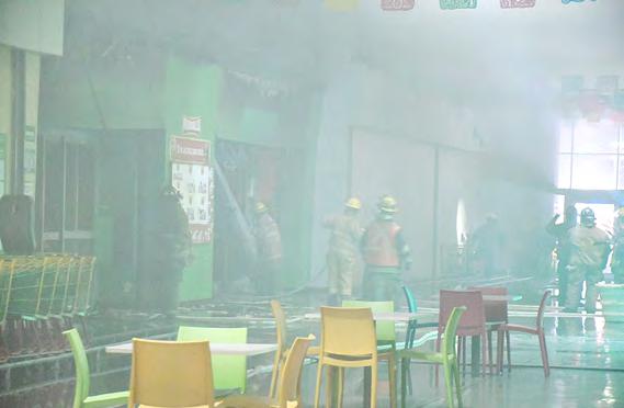z Elementos de bomberos atacan el incendio por la parte frontal de la tienda. z Sara Irma Pérez atendió a los vecinos que se resguardaron en el albergue durante el incendio.