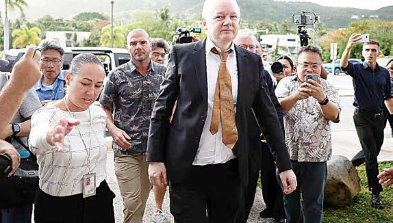 Assange, de 52 años, vestido de traje negro y corbata ocre, ha partido este martes por la tarde desde Bangkok rumbo a las Islas Marianas del Norte, paso previo a la confirmación del acuerdo suscrito con las autoridades de Estados Unidos y que le ha permitido quedar en libertad tras cinco años encarcelado en Reino Unido.