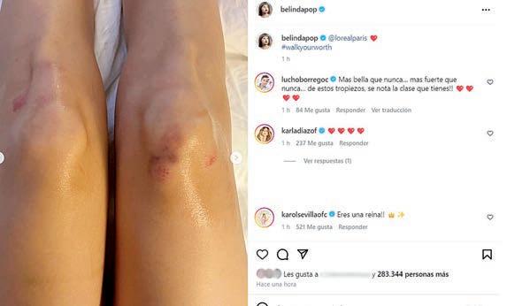 El accidente ocurrió cuando Belinda, vistiendo un mini vestido rojo y zapatos de plataforma, caminaba por la pasarela y, según sus propias palabras, los zapatos se pegaron a la alfombra, lo que provocó que perdiera el equilibrio y cayera de rodillas ante el público.