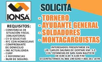 Se solicita Operaador quinta rueda para Transporte de Combustible, Experiencía miníma 5 años, licencia vigente tipo E. *Se solicita Mecánico Disel para trabajar en Saltillo. Favor de comunicarse al Tel. 844489-63-00, 844-489-64-60. (58207 : 13-May : 04-Jun)