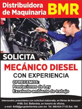 Linea Transportista Solicita Mecánico Diesel y Ayudante de Mecánico Diesel con experiencia en motores ISX y N14. Tel. 866-159-1142, 866-636-43-13. (58238 : 26-May : 30-May)
